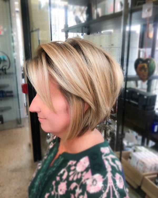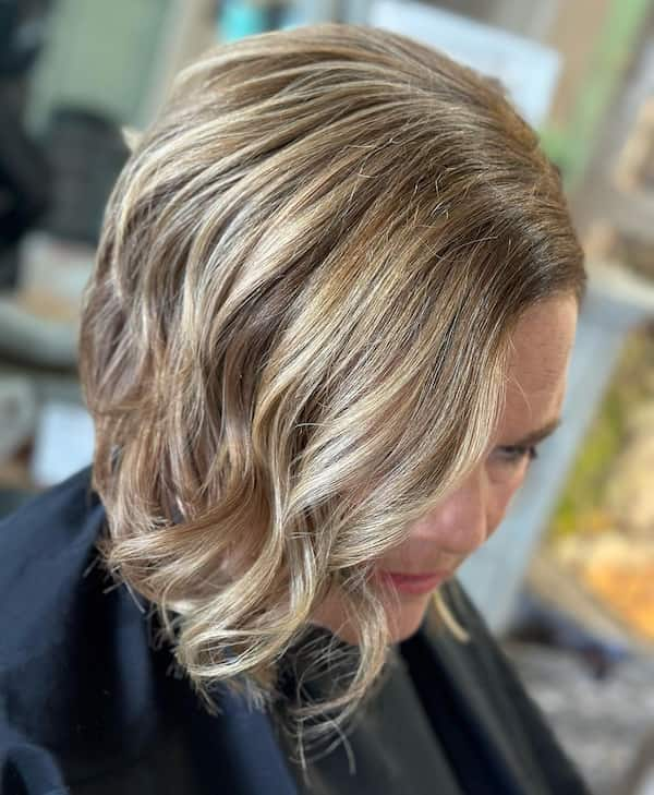 Blonde hair adds brightness and vibrancy to a short angled bob. This style works particularly well with soft waves or curls, as the natural highlights catch the light and emphasize the haircut’s layers. Its short length makes it easy to manage, while the angled structure frames the face beautifully. This cut is ideal for women seeking a low-maintenance, yet chic and lively hairstyle.