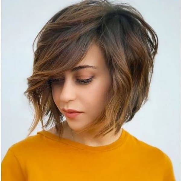 The short angled bob is a contemporary twist on the classic bob, designed to create an elegant, modern look without needing long hair. The angled cut naturally frames the face, giving it structure and highlighting the jawline. Its short length makes it versatile, ideal for women who prefer a low-maintenance yet fashionable style. Whether worn straight or with soft waves, this cut offers a polished appearance that works for professional settings and casual outings alike.