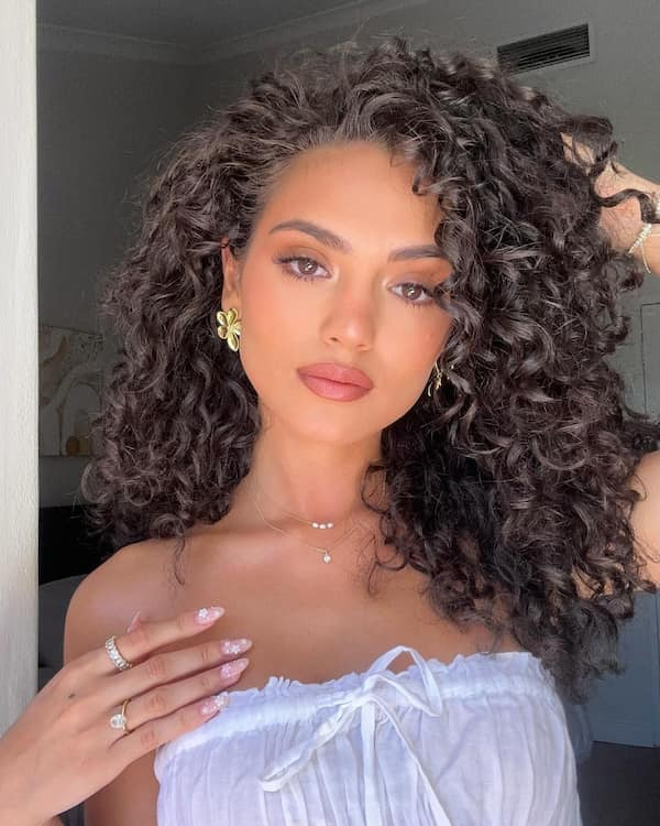 Embrace the natural beauty of thick brunette curls with either a side or center part. Side-parting works especially well for oval faces, while this look exudes confidence and effortless charm for a beach day or casual outing.