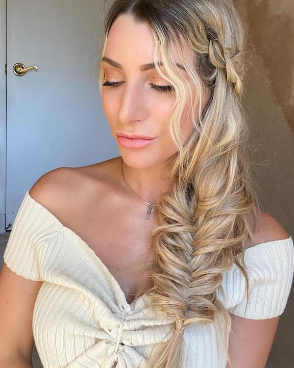 A side braid keeps hair off the face while bangs frame your features elegantly. Perfect for activity-filled beach days, it combines function with chic styling.