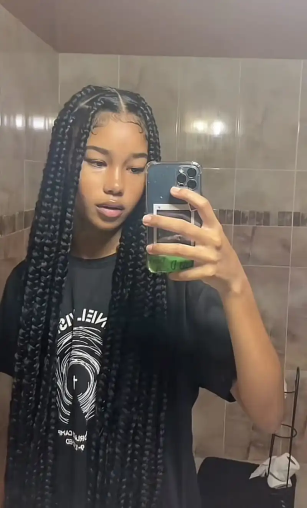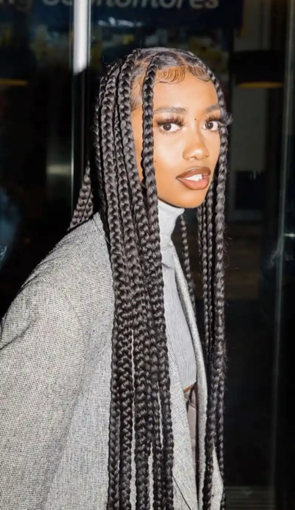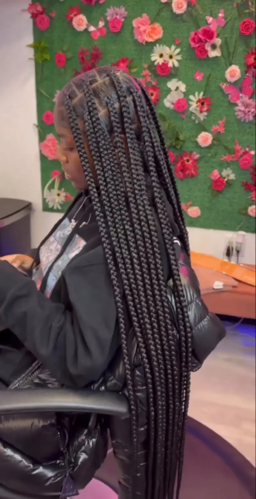Waist-length big box braids are a timeless style that exudes elegance and drama. The extended length allows for a wide variety of styling options, from high ponytails and buns to cascading free-flowing hair. These long braids create a striking silhouette that emphasizes the hair’s shine, texture, and volume. Perfect for social events, photoshoots, or casual wear, waist-length braids offer both aesthetic appeal and protective benefits. Their versatility allows for accessorizing with beads, cuffs, or threads, making them a go-to style for anyone looking to make a memorable statement.