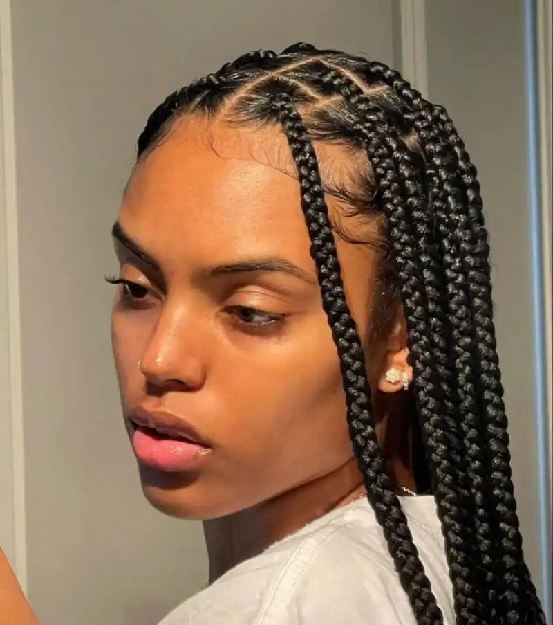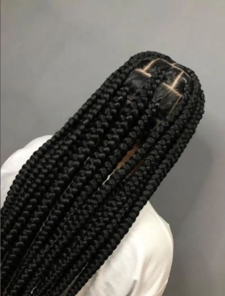 Star-parted big box braids feature a unique, eye-catching geometric design at the crown. The star-shaped parting adds artistic detail while highlighting precision and creativity. Although intricate and time-consuming, this style is ideal for those who want their braids to stand out as a statement hairstyle. Perfect for photoshoots, special occasions, or festivals, the star part draws attention and adds flair to a classic protective style. It balances artistry with functionality, offering both a visually striking design and the protective benefits of traditional box braids.
