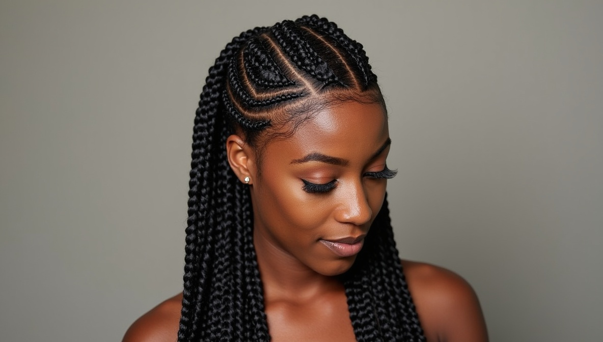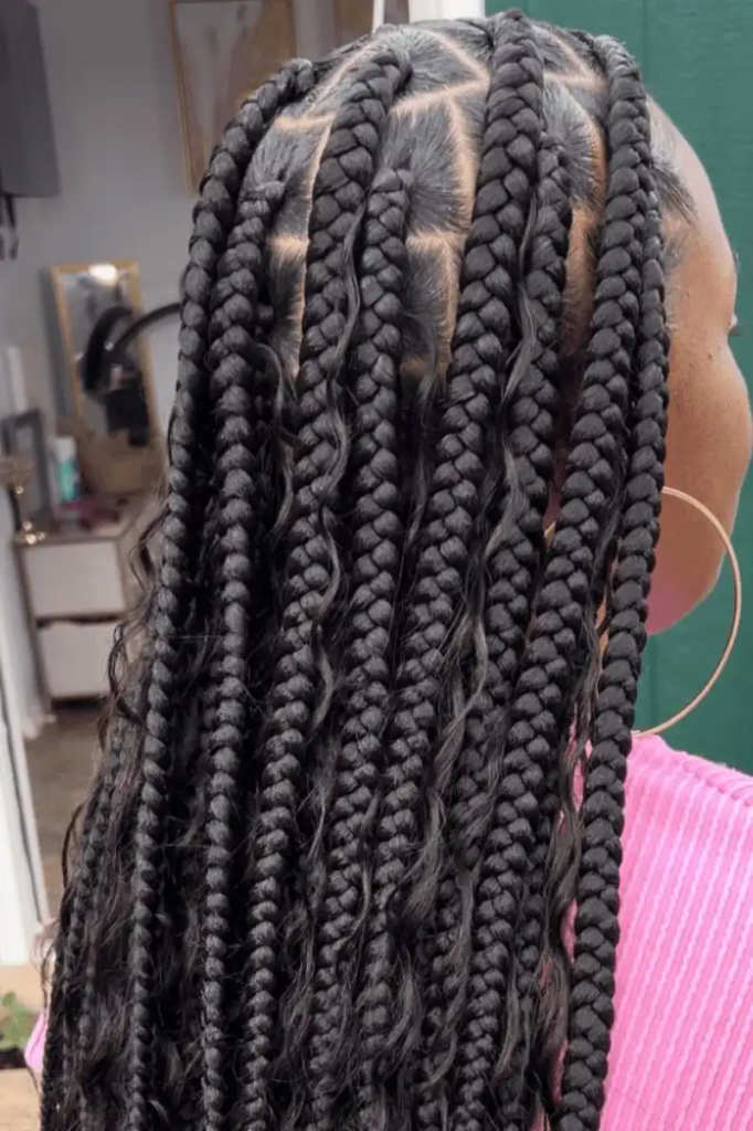 Zigzag-part big box braids combine bold, thick braids with a playful, eye-catching scalp design. The zigzag part adds artistic detail while keeping the overall style manageable and protective. This technique enhances visual interest and allows the wearer to showcase individuality without relying on accessories. It works well for casual outings, formal events, or festival looks. The large braids retain elegance while the zigzag part provides a modern, fun twist on traditional styles. It’s perfect for anyone wanting a distinctive, polished protective hairstyle with personality and flair.