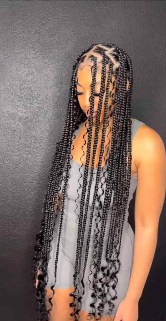 Extra-long box braids with curled ends offer a dramatic, statement-making appearance. The impressive length combined with jump curls creates a striking, mermaid-like effect that turns heads. While heavier than shorter styles, these braids provide endless styling options, from high ponytails and buns to cascading waves. Perfect for events or creative photoshoots, the curls add softness and movement while enhancing the protective benefits of the braids. This bold style balances elegance, glamour, and versatility, making it ideal for anyone looking to showcase long, luxurious braids.