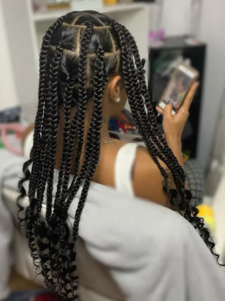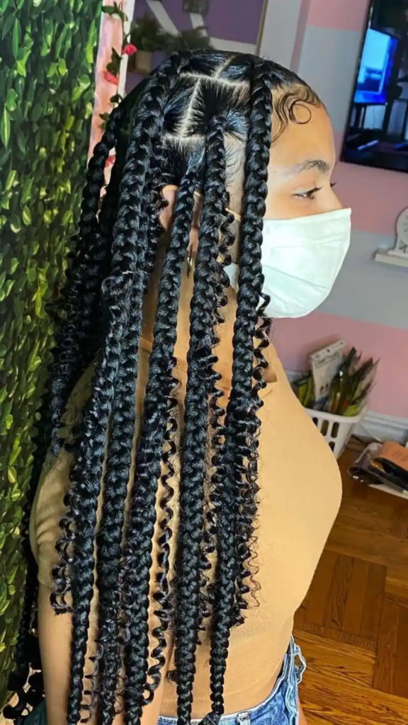 Big box braids with curled ends add softness, volume, and a feminine touch to a bold protective style. The curls at the tips provide movement and visual interest while keeping the braids intact and low-maintenance. This style works well for both casual and formal settings, offering flexibility to style the hair in half-updos, ponytails, or flowing freely. Using Flexi-Rods or curlers can maintain the curls for weeks, keeping the hairstyle fresh and vibrant. This approach balances elegance with playfulness, making the protective braids functional, beautiful, and versatile.