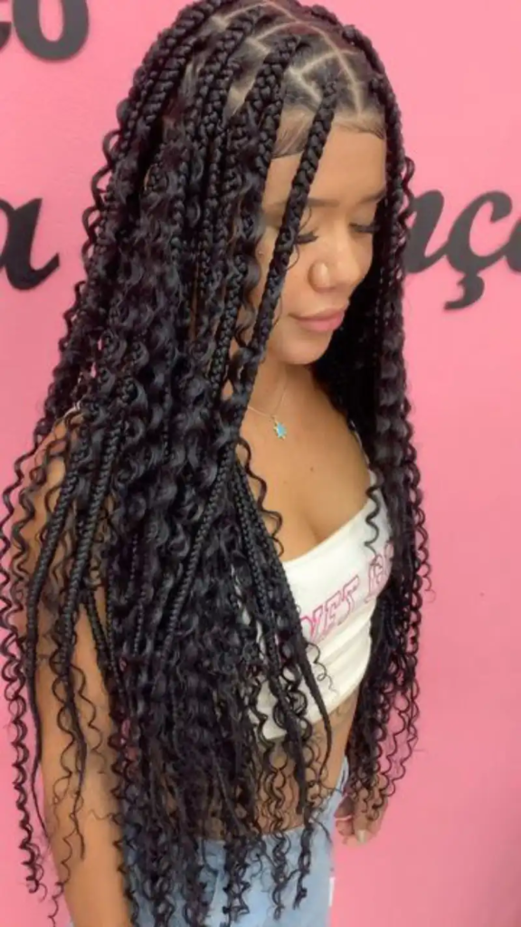 Boho curly box braids create a carefree, relaxed vibe with loose, flowing curls throughout the braids. The slightly messy, free-spirited appearance evokes bohemian charm, especially when accessorized with wooden beads, cuffs, or threads. This style balances protective benefits with a casual, fashion-forward look. Its loose texture allows movement and adds softness around the face, creating a youthful, playful aura. Ideal for casual outings, festivals, or photo opportunities, boho curly braids capture a trendy, effortless energy while maintaining hair health and style longevity.