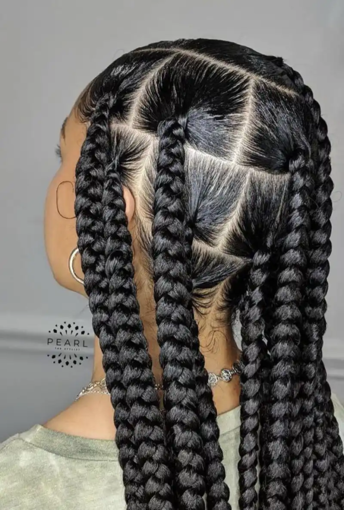 Box braids with triangle parts bring a geometric and artistic dimension to protective hairstyles. Each triangular section is carefully shaped before braiding, creating a unique scalp pattern that adds visual interest even when the hair is pulled back. Though it requires extra precision and time, the result is a striking, head-turning style. Triangle-part braids are perfect for special occasions or anyone who wants their protective style to reflect creativity and sophistication. This method enhances both the beauty of the braids and the craftsmanship involved, offering a bold and modern update to traditional box braids.