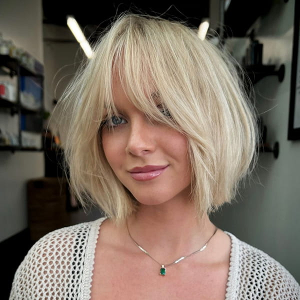 The messy bob with bangs offers a relaxed, effortless vibe. Tousled layers and casual bangs create texture and volume without sacrificing the bob’s structure, making it a fun and versatile style for everyday wear.