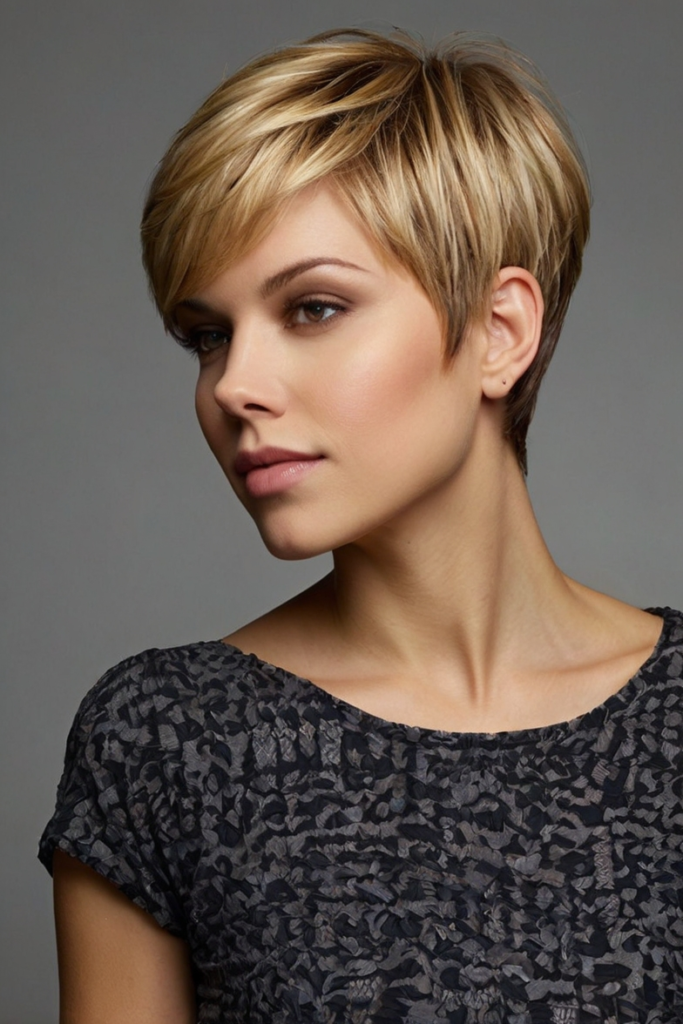 Side-swept layered pixies beautifully frame the face, adding softness and movement. This versatile cut suits oval face shapes particularly well and can be styled elegantly for formal or casual occasions.