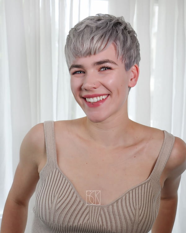 A layered pixie with bangs blends cute and chic effortlessly. The bangs soften the face while the layers add dimension and volume. This style is excellent for women looking to enhance their facial features while maintaining an easy-to-style haircut.
