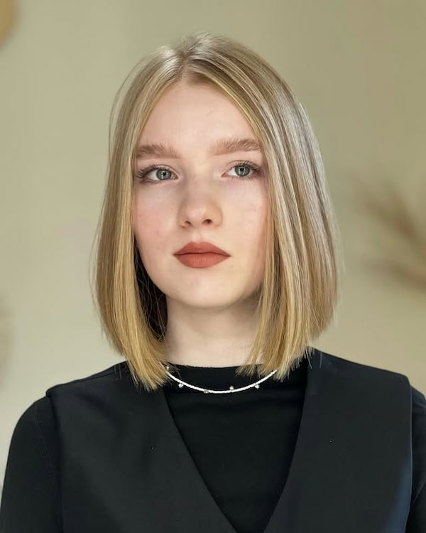 This version of the blunt bob incorporates layers to add subtle texture without losing its clean shape. The layered effect enhances volume and movement, allowing for flexible styling options. Whether parted to the side or down the middle, this haircut adapts beautifully to different face shapes while retaining a crisp finish.