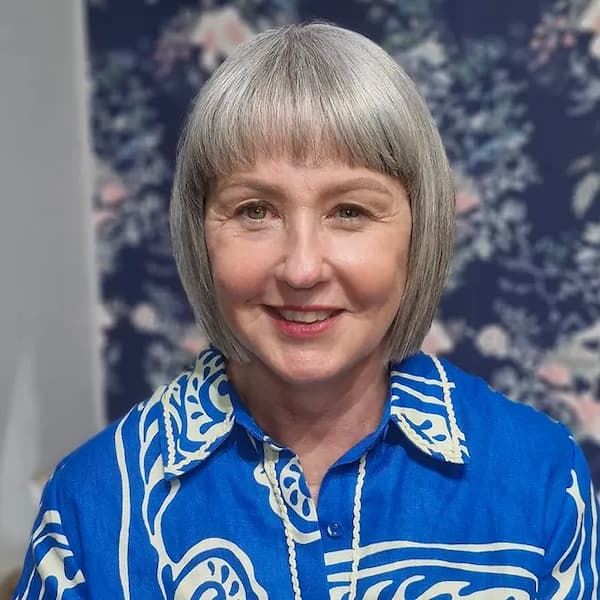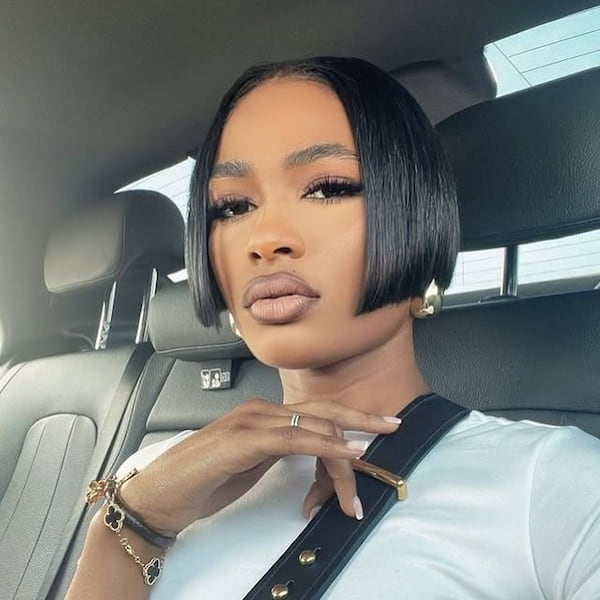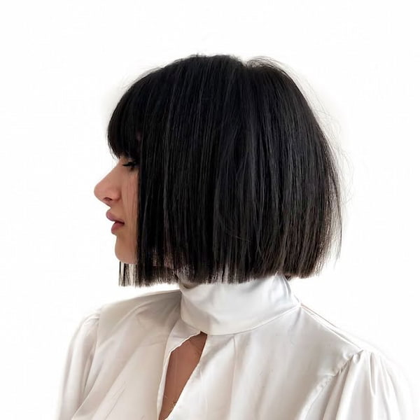 Symmetry and precision define this striking hairstyle. The full blunt bob combined with equally blunt bangs creates a cohesive, high-impact look that feels confident and polished. Every line is intentional, resulting in a haircut that appears meticulously styled at all times. This look is ideal for anyone who appreciates bold structure and a refined finish that turns heads effortlessly.