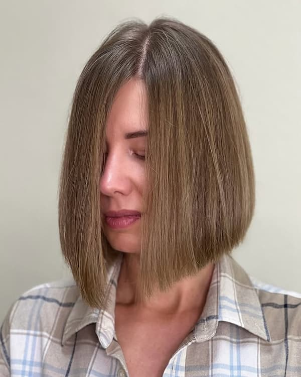 This style proves that small details can make a big impact. The gentle angle gives the blunt bob a natural flow, avoiding harsh lines while still maintaining structure. It moves gracefully with everyday motion, offering a relaxed yet refined appearance. The understated angle enhances the haircut’s versatility, making it easy to style straight or with subtle texture. Ideal for those who prefer a minimalist look with a polished edge, this bob feels modern without being overly dramatic.