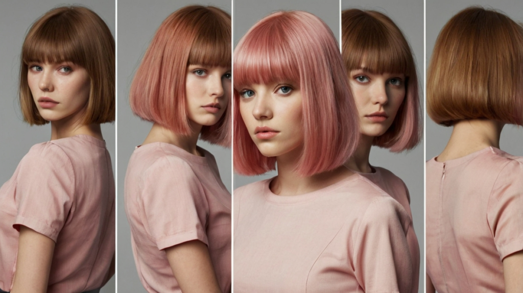 A soft pink hue instantly refreshes the classic blunt bob, adding a youthful and expressive twist. The straight bangs anchor the look, ensuring the playful color still feels cohesive and intentional. This hairstyle allows for creativity while maintaining clean lines and balance. It’s perfect for anyone wanting to experiment with color without losing the elegance of a blunt cut.