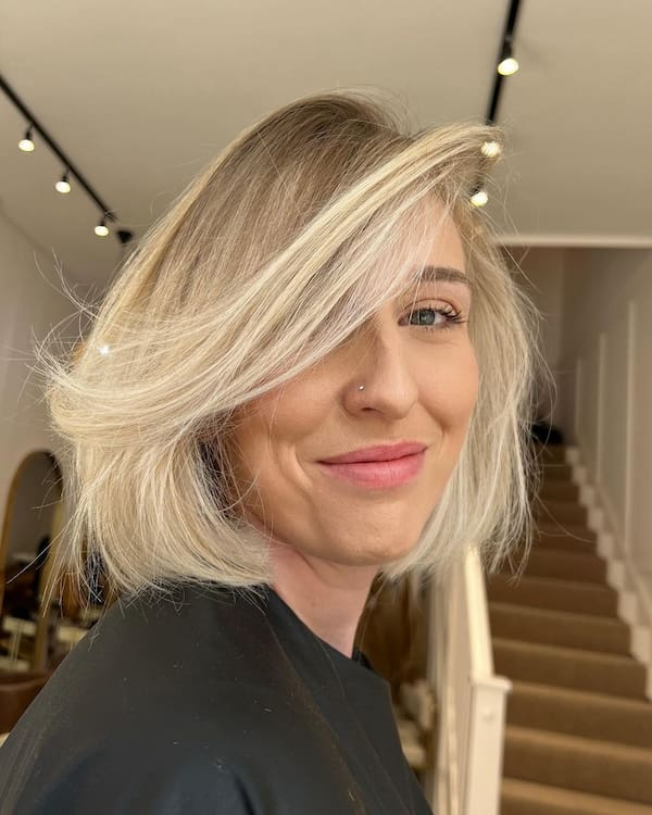 Messy side-swept bangs bring a relaxed and playful vibe to a bob haircut. The bangs add volume and dimension to fine hair while framing the face softly. This casual, effortless style works well for weekend outings or informal events and can be enhanced with light texturizing sprays or sea salt mists for added body and movement.