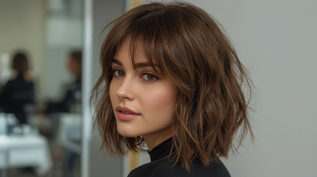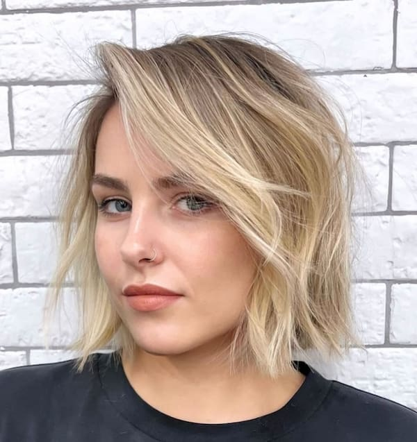 This bob combines messy layers with blunt bangs to create a playful, full-bodied style. The layers add volume, particularly for fine hair, while the blunt bangs draw attention to the face and create a bold, stylish look. This haircut is ideal for casual or semi-formal settings and allows for versatile styling—from tousled and carefree to smooth and polished.