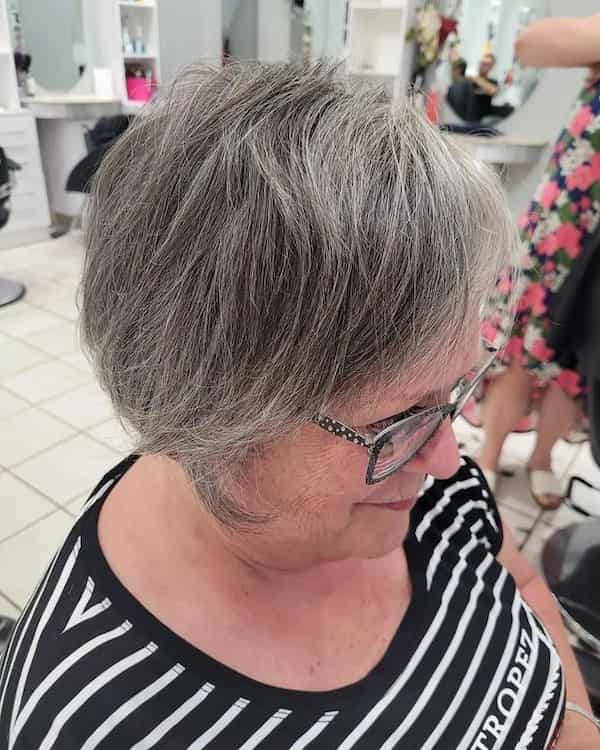 Glasses and bobs are a match made in style heaven, creating a polished and sophisticated appearance. A textured bob adds dimension to the hair while allowing glasses to complement the face rather than dominate it. Straight angles with soft layers enhance structure, and rich brunette or dark tones add depth to the cut. This style works particularly well for older women who want a refined yet approachable look. With the right styling products, the textured bob maintains its shape and fullness throughout the day, providing a chic, comfortable hairstyle.