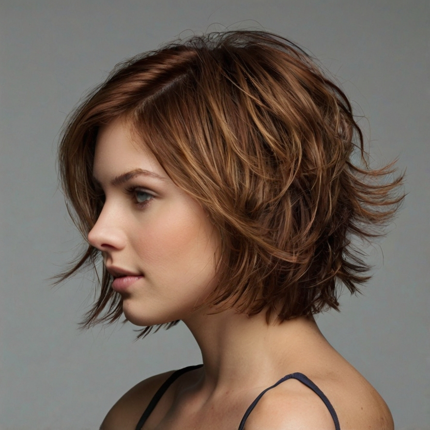 This playful bob is layered to create volume and texture, with bangs that accentuate the eyes and cheekbones. Layers enhance movement, making the haircut lively and dynamic. Styling with a small amount of mousse or texturizer ensures that the cut maintains shape while looking effortless. This bob is ideal for women seeking a fun, youthful, and versatile haircut that works for various occasions.