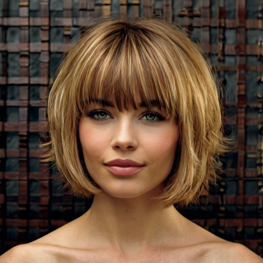 Choppy bangs bring life and dimension to this subtly layered bob. The layered cut allows the hair to move naturally, while bangs draw attention to the eyes and add personality. Daily styling is easy with a small amount of mousse or texturizing cream to maintain bounce and shape. This bob is perfect for women seeking a playful yet polished style that works for everyday activities or casual outings.