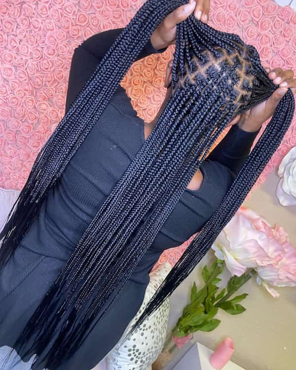 Long and small box braids create a sleek and flowing appearance. The thin braid size combined with added length enhances movement and styling flexibility. Choosing a color that complements your complexion can elevate the entire look.
