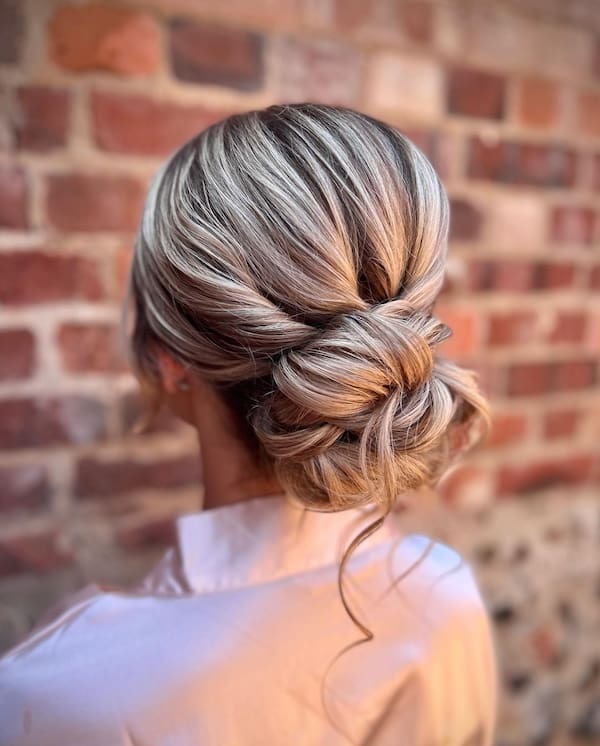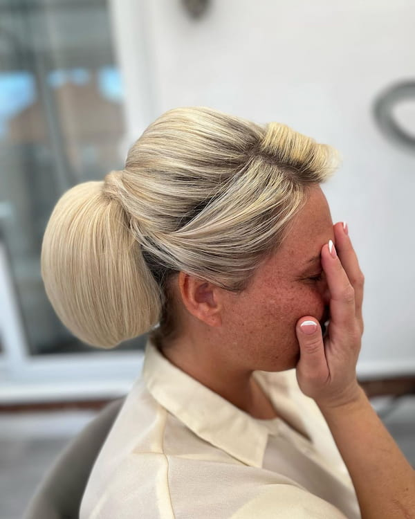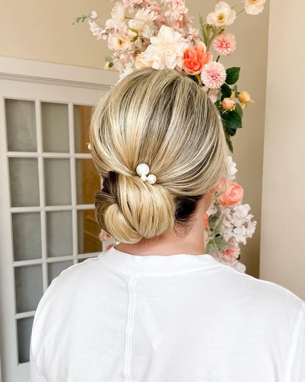 A low bun on blonde hair appears especially neat and polished. The smooth finish emphasizes the hair’s shine and length, creating a refined, minimalist style perfect for weddings, work events, or casual outings.