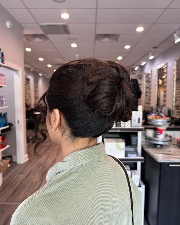 This smooth, minimal knotted bun combines simplicity with elegance, enhanced by a subtle decorative pin. It’s perfect for weddings or formal events, offering a sophisticated style without excessive complexity.