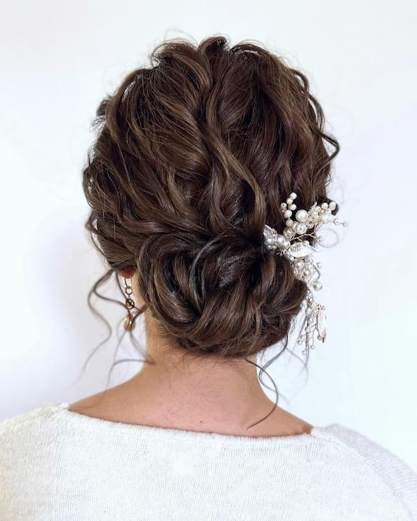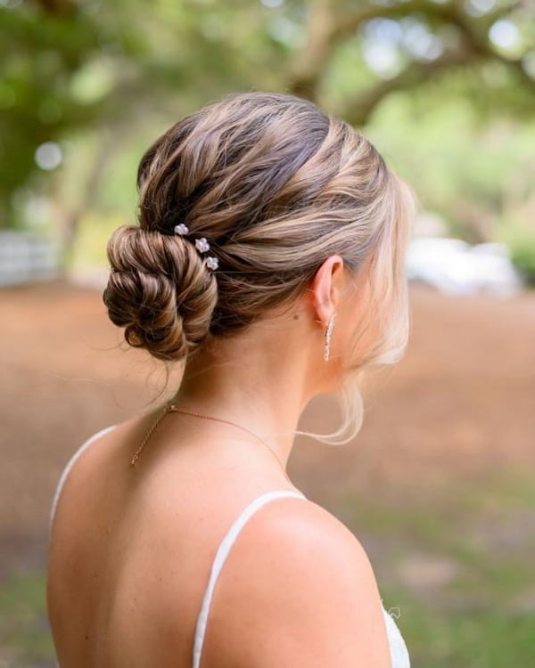 A messy bun adorned with bridal pins delivers both romance and glamour. The added pins instantly signal bridal elegance, making this hairstyle an ideal choice for brides or bridal party members who want a chic, attention-grabbing look.