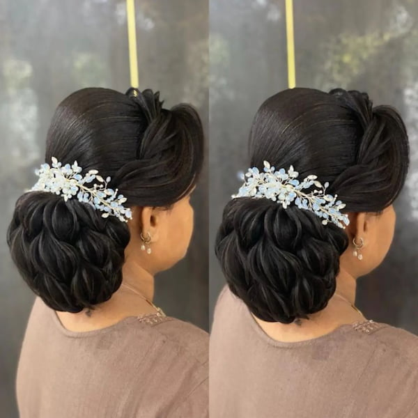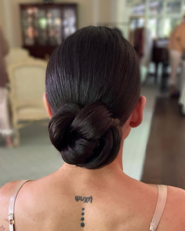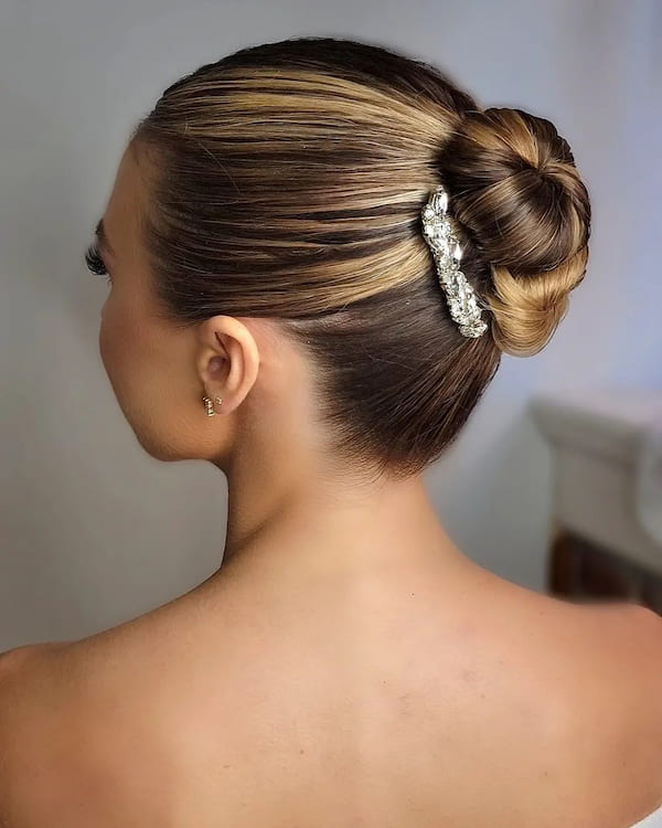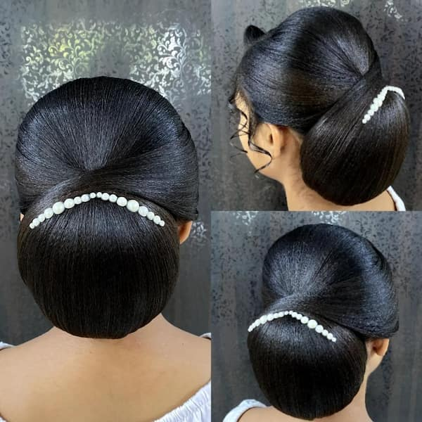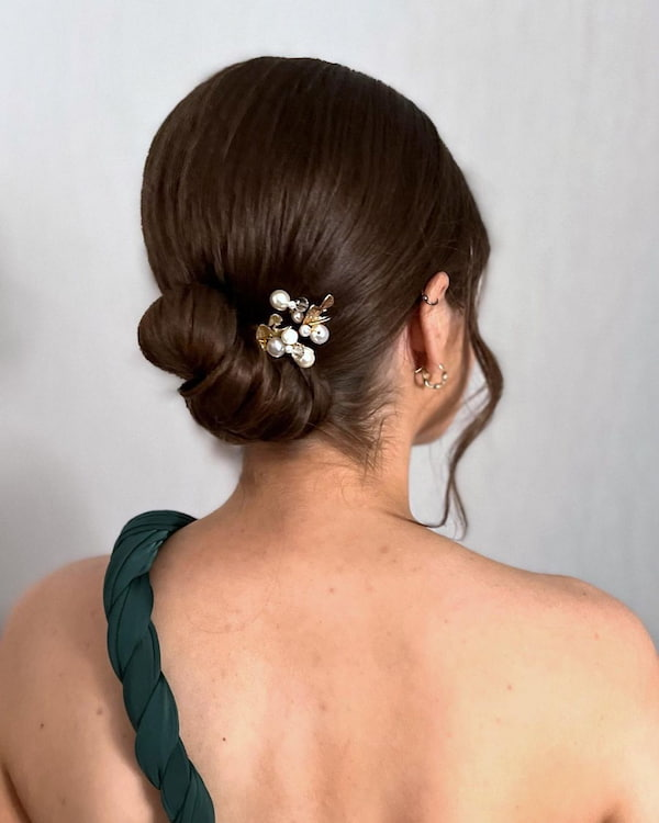 This bun strikes the perfect balance between minimalism and elaborate styling. Small decorative pins enhance its elegance, making it a suitable choice for brides or formal gatherings while remaining manageable and visually appealing.