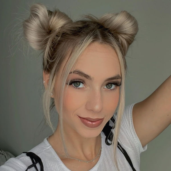 For a whimsical, eye-catching style, a double bow bun offers symmetry and charm. The combination of perfectly aligned buns and meticulous makeup ensures a playful yet polished look, ideal for photoshoots or fun celebrations.