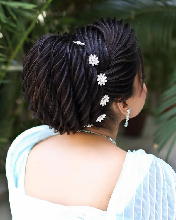 For those who appreciate more detailed styling, a larger, twisted bun with pins combines complexity with elegance. This style works beautifully for formal occasions and allows creative use of hair accessories for a polished finish.