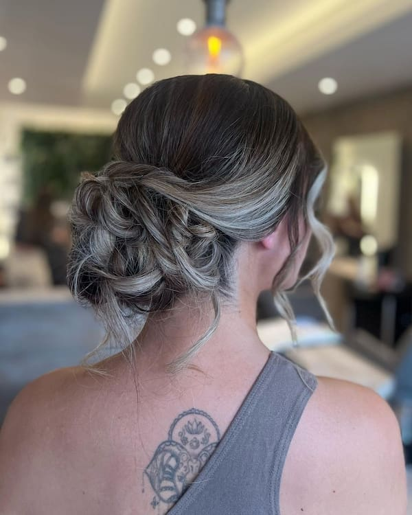 Incorporating a side twist into a messy bun adds depth and flair. This approach enhances the bun’s texture and provides a dynamic, visually appealing style suitable for casual gatherings, parties, or fashion-forward events.