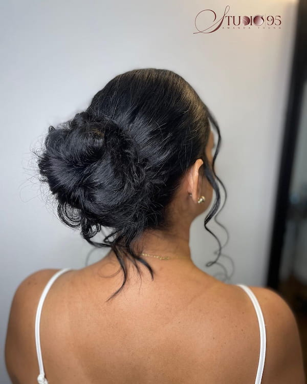 Not all buns need to be polished to look attractive. A low bun with a lightly messy texture offers a relaxed, effortlessly chic vibe. This style works well for casual weddings, parties, or even everyday wear when you want a charming, low-maintenance look.