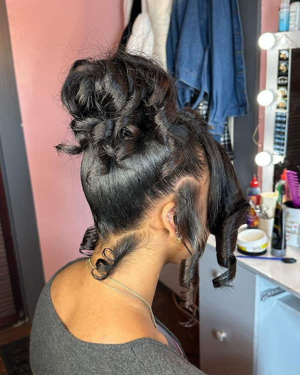 Adding curtain bangs to a curly bun softens the face and complements the natural texture. This combination creates a romantic, approachable look ideal for both casual outings and formal gatherings.