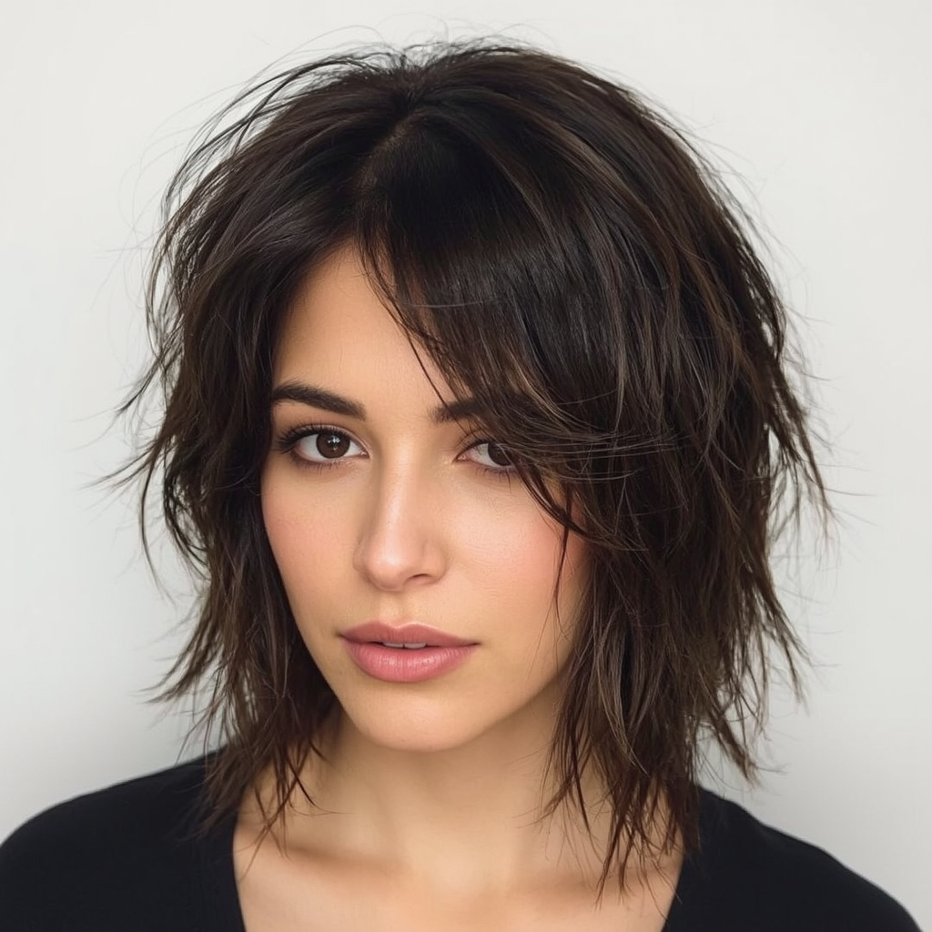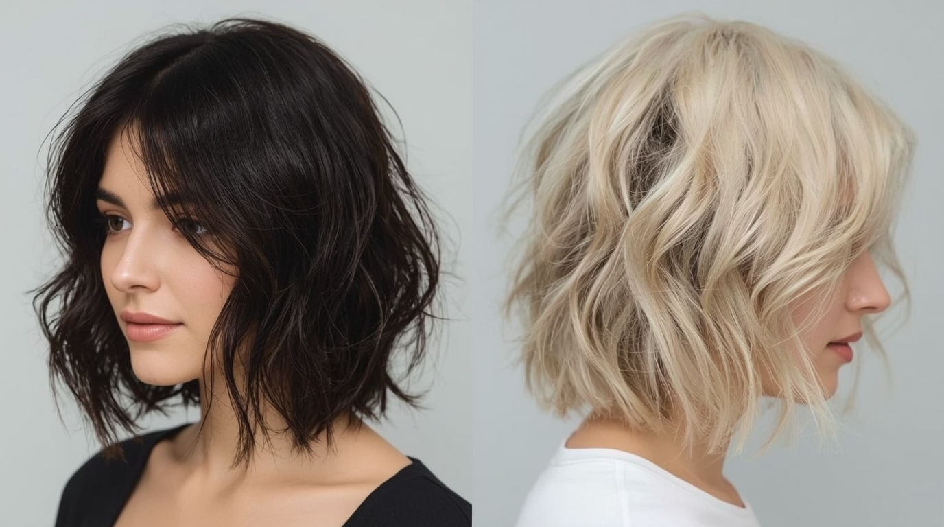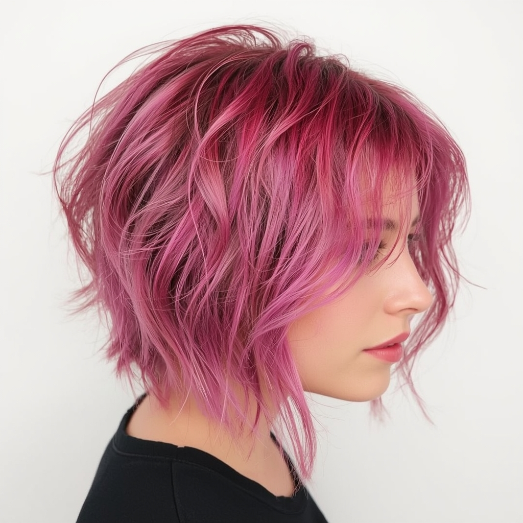 Uneven lengths and tousled layers create an edgy, fashion-forward bob. This modern cut offers texture, volume, and a relaxed yet stylish appearance.