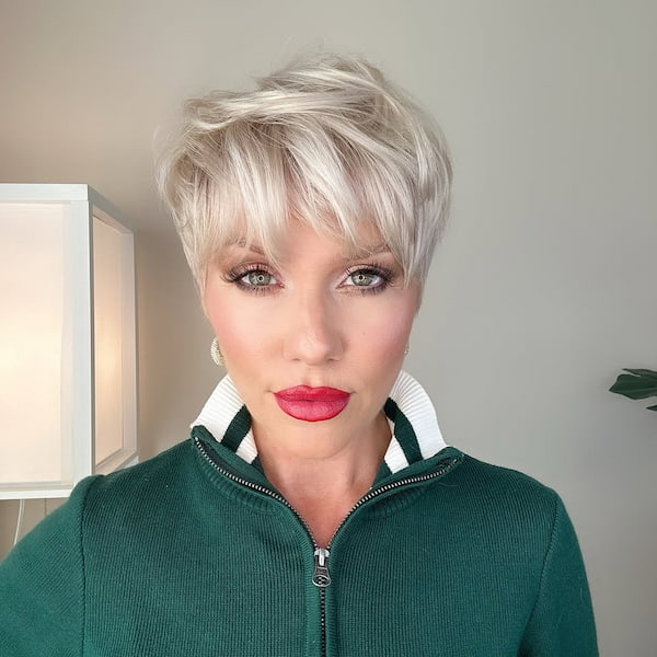 The glam pixie with choppy bangs strikes a balance between edgy and sophisticated. A side undercut adds a subtle rock-inspired twist, while the choppy bangs provide volume and playful texture. This haircut is versatile, lending itself to polished, formal styling as well as casual, tousled looks. It’s perfect for women who enjoy modern trends but prefer a manageable style. With the right products, such as volumizing mousse or texturizing sprays, this haircut can maintain its glam appeal all day without losing its shape.