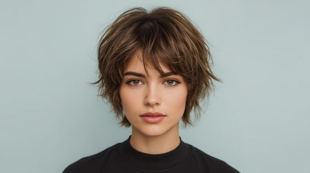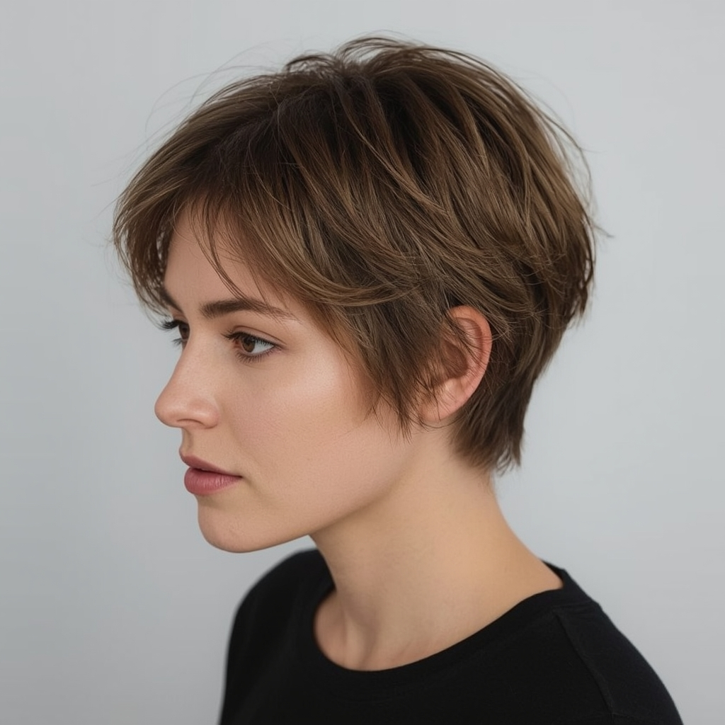 The minimalist pixie with overlapping layers focuses on simplicity, structure, and subtle elegance. The layers gently overlap, creating soft texture and movement without excessive volume. This haircut works particularly well for oval and round faces, giving a polished yet effortless appearance. It’s an ideal choice for women who appreciate understated elegance and want a haircut that looks sophisticated with minimal styling.