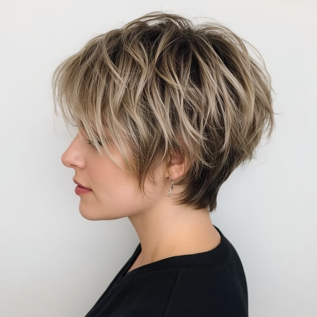 The brown and blonde choppy pixie adds depth and contrast through subtle color blending. The brown base provides richness, while blonde highlights bring brightness and dimension. This haircut works best with texturizing products to maintain softness and prevent side growth from affecting the shape. It’s a chic and modern style that balances bold color contrast with easy-to-manage layers, making it ideal for women who want a fashionable yet practical pixie cut.
