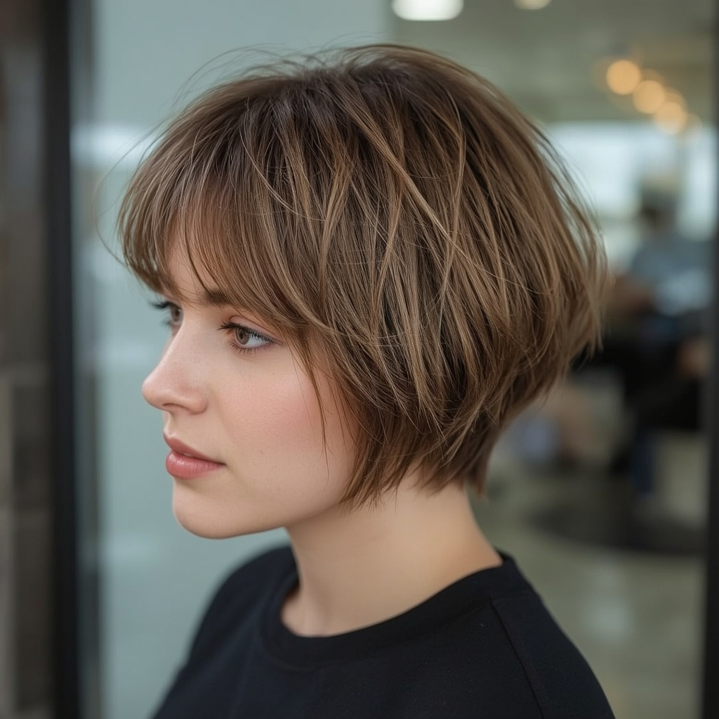 This perfectly layered pixie with bangs is a classic and universally flattering cut. The layers are styled carefully to fall naturally, enhancing the hair’s volume and texture. Bangs frame the face delicately, adding charm and softness. This haircut is suitable for a variety of face shapes and hair types, making it an enduring favorite for those seeking a relaxed yet polished look that can be easily maintained.