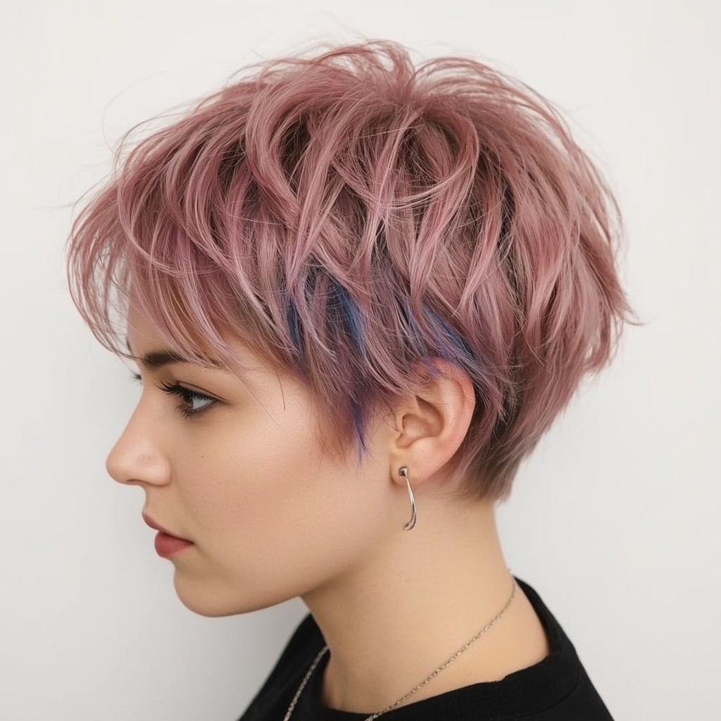 For a playful and unique style, the pink pixie with blue highlights stands out. The contrasting shades create a vibrant, fun aesthetic while maintaining a chic pixie silhouette. This haircut is ideal for women who enjoy expressing their personality through hair color and love experimenting with bold, creative looks. Choppy layers can enhance the effect by adding texture and movement, giving the hairstyle a dynamic, energetic vibe.