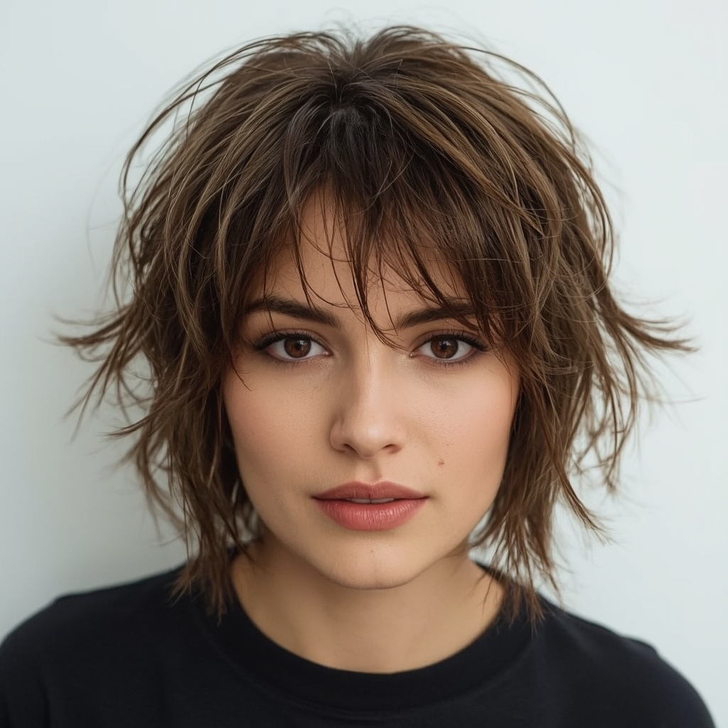 A simple pixie with choppy bangs is a timeless, fuss-free haircut. The choppy bangs add relaxed softness around the face, while the pixie base keeps the style sleek and manageable. Ideal for women who prefer a low-maintenance yet chic look, this haircut works well for all hair types. You can style it with minimal effort, using texturizing cream or light mousse to add volume without overcomplicating the routine.