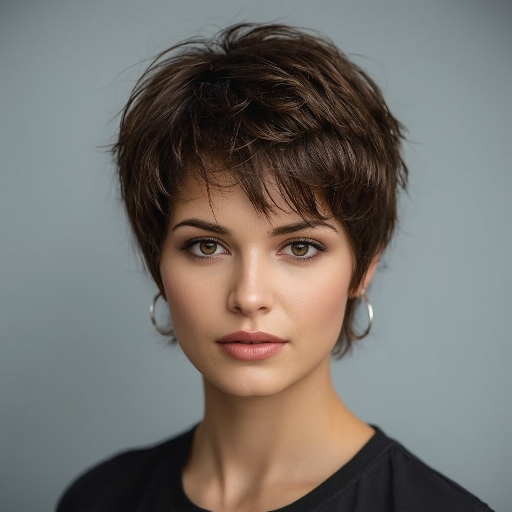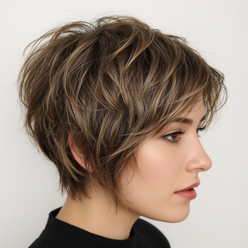 The messy pixie with multiple layers is perfect for women seeking a carefree, low-maintenance style. The layered structure adds texture and volume, while the slightly untamed finish contributes to a fun, edgy appearance. This haircut works well with bangs for added charm and versatility, making it suitable for casual outings, weekend events, or relaxed office environments. Minimal styling effort is needed to maintain the messy, lived-in look.