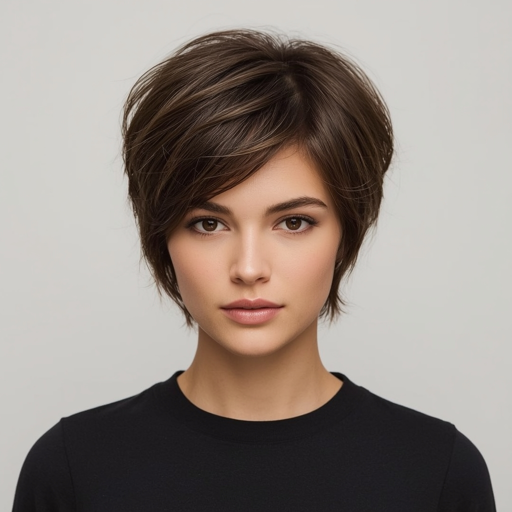 Long side-swept bangs give the pixie cut a sophisticated, mysterious touch. They frame the face beautifully, allowing versatility in styling for both casual and formal settings. This haircut can be layered to create subtle volume, giving a polished yet relaxed appearance. Whether straightened for sleekness or slightly curled for softness, this style offers elegance and practicality in one chic package.