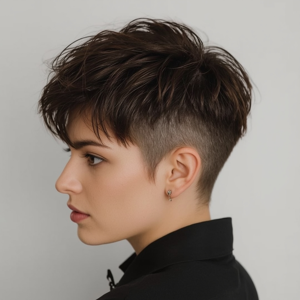 The precision undercut choppy pixie balances structured lines with textured movement. A skilled stylist ensures the undercut is sharp and clean, while the choppy layers on top provide a playful contrast. This haircut is perfect for women who want a modern, edgy look that’s both bold and maintainable. Regular trims and the right styling products will keep the structure intact while allowing the top layers to retain their lively, textured appeal.
