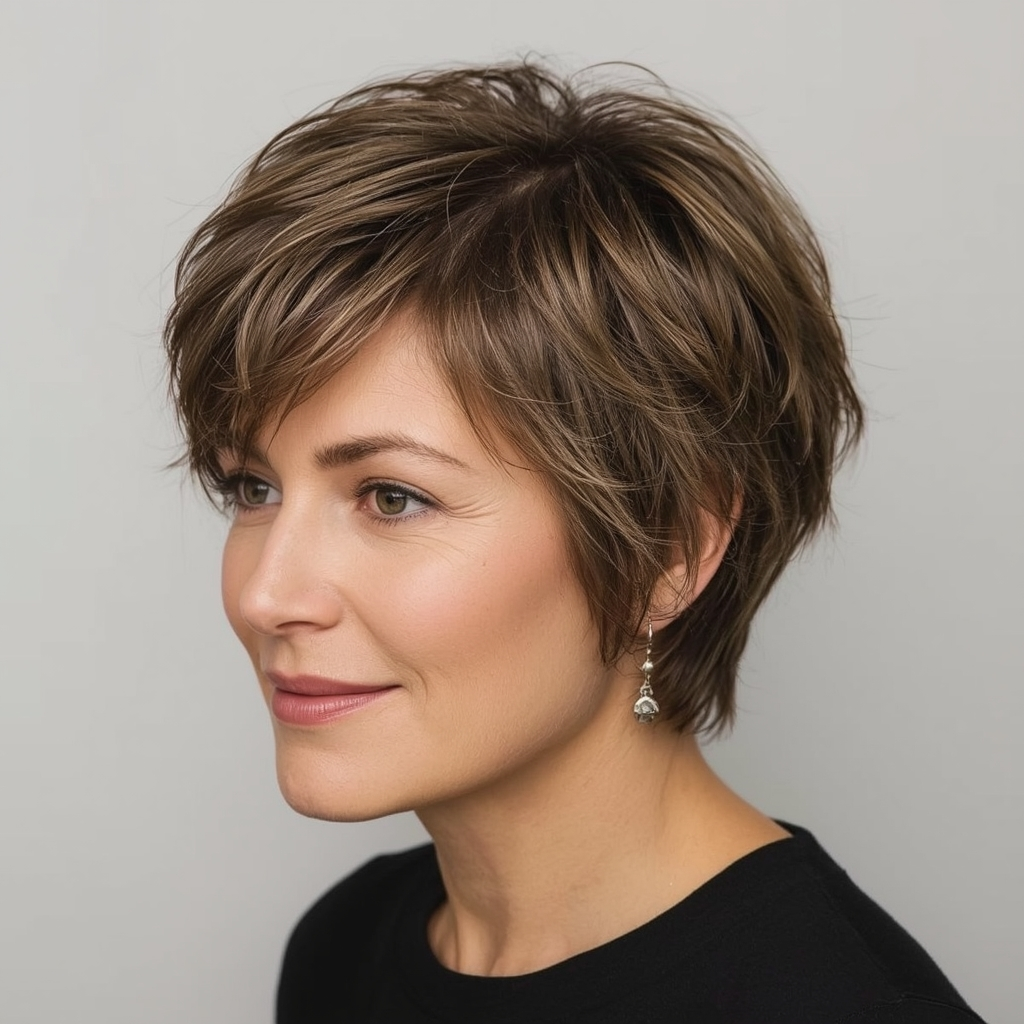 A choppy pixie is a timeless, flattering option for women over 40. This haircut helps maintain a youthful appearance while remaining chic and sophisticated. The layers and textured finish create volume and movement, preventing the style from looking flat or lifeless. This cut works well with natural hair colors or subtle highlights, offering a fresh and modern approach to pixie hairstyles for mature women who want to look stylish every day.