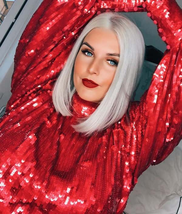 A platinum-blonde bob with a center parting is sleek and chic. Its simplicity enhances facial features while the bright tone makes it ideal for Christmas Eve gatherings.