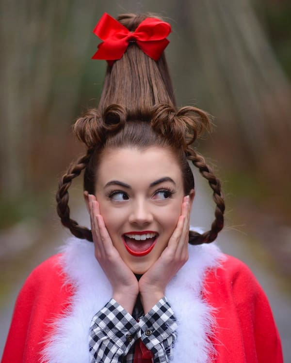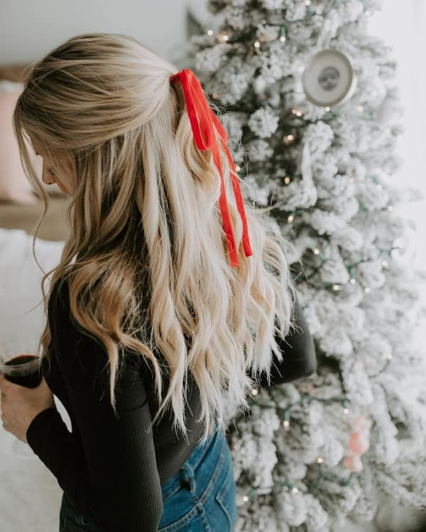 A half-up half-down style is both quick and adorable. Adding a red ribbon immediately gives it a festive touch, making it perfect for Christmas parties without requiring a complicated style.