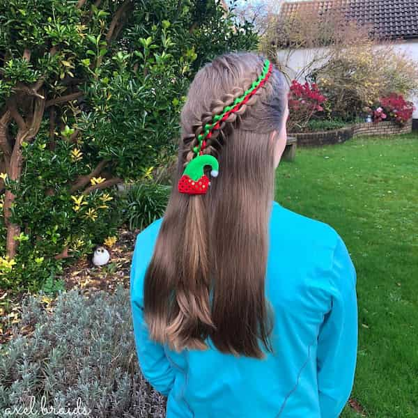 Braiding a ribbon into the hair paired with a half-down style creates a unique holiday look. Green and red ribbons mimic Christmas colors, giving a fun and festive twist to a simple braid.