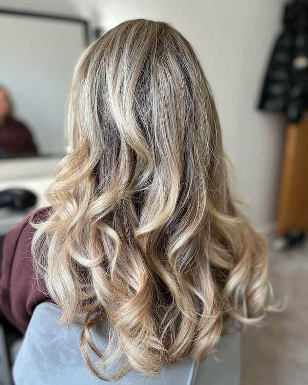 Long, wavy, dimensional hair is perfect for parties. The mix of tones adds depth, and the voluminous waves ensure a festive, eye-catching appearance.