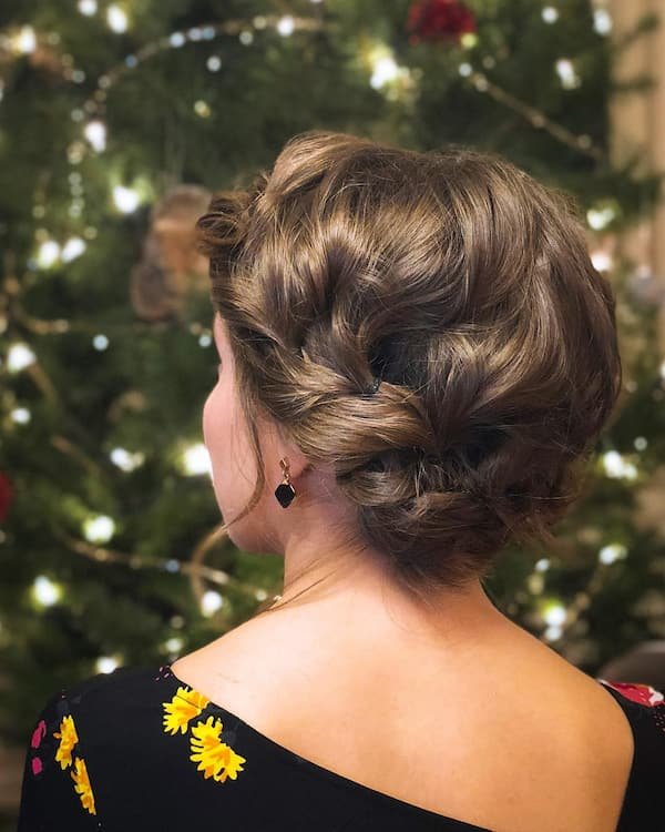 A large, single braid styled into an updo is festive and playful. Adding glittering stars or red adornments gives it a Christmas-themed charm while keeping hair secure for the entire evening.