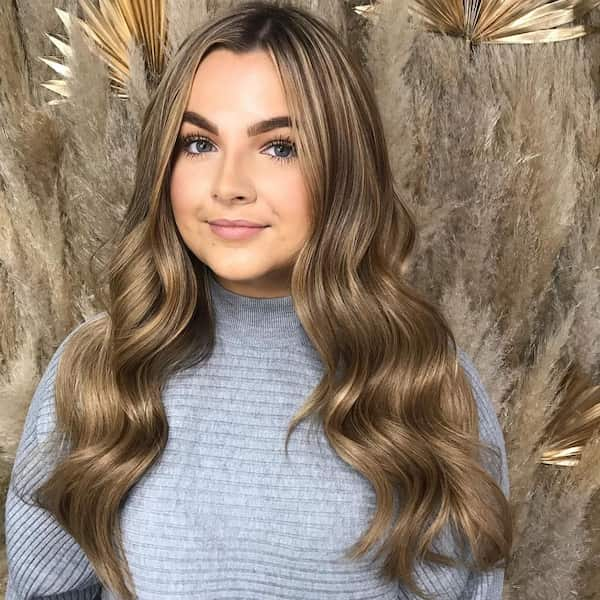 Extra volume with defined curls makes hair look rich and luxurious. A dimensional brown-blonde blend enhances the festive vibe, perfect for standing out at Christmas parties.